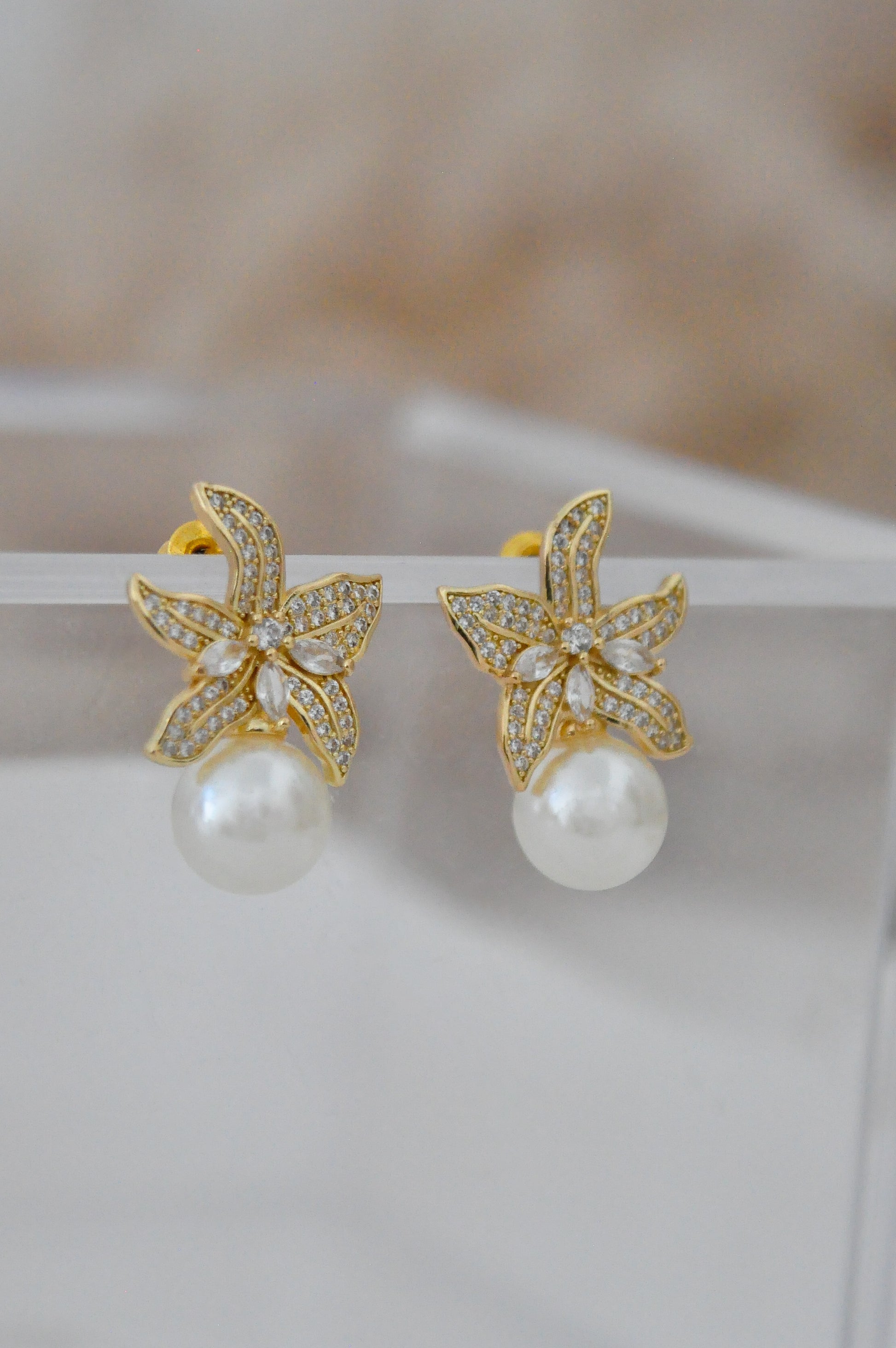 Aretes de aleación de cobre con baño oro, zirconias y perla.