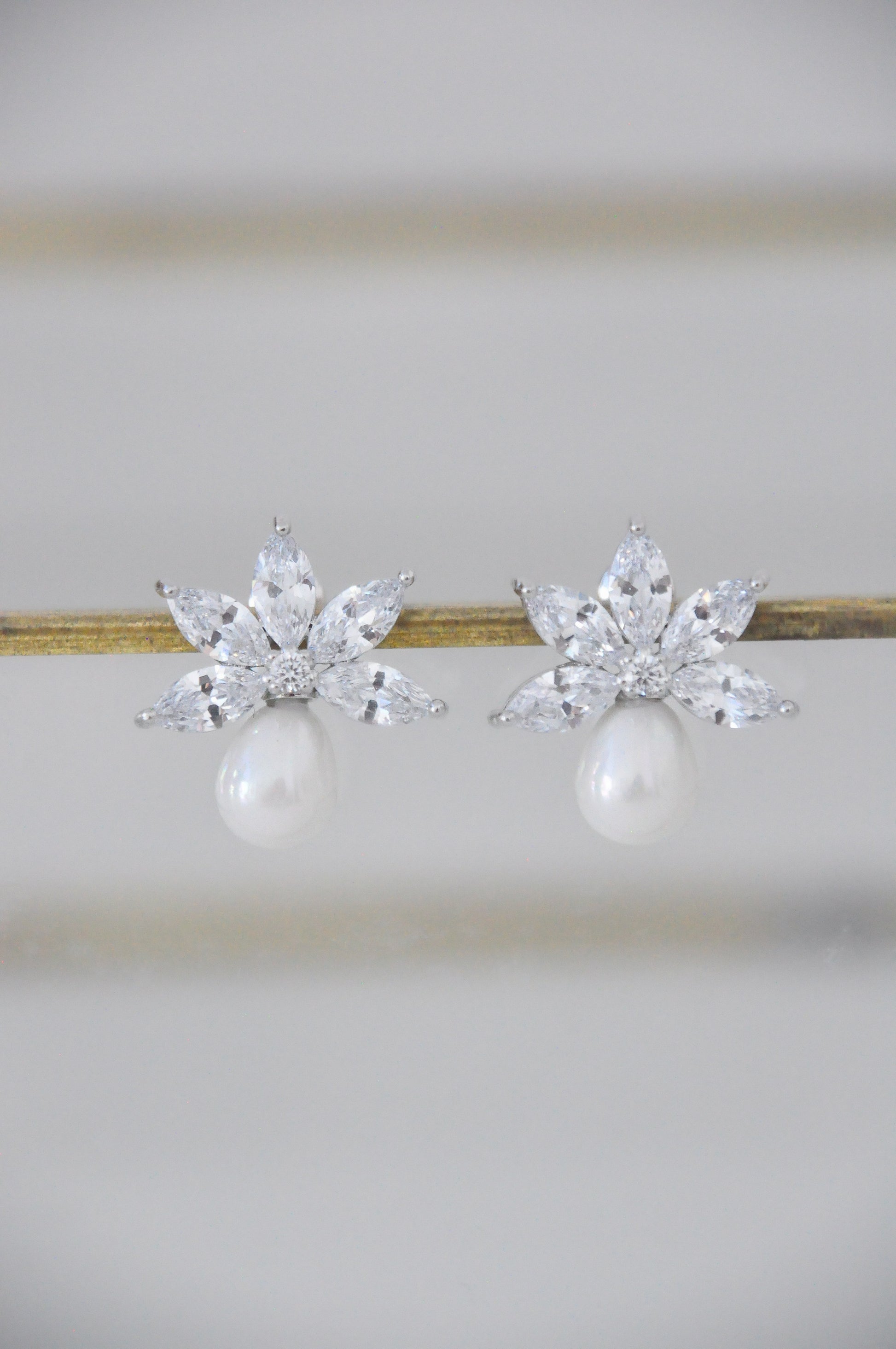 Aretes de aleación de cobre con baño plata, zirconias con perla en gota.