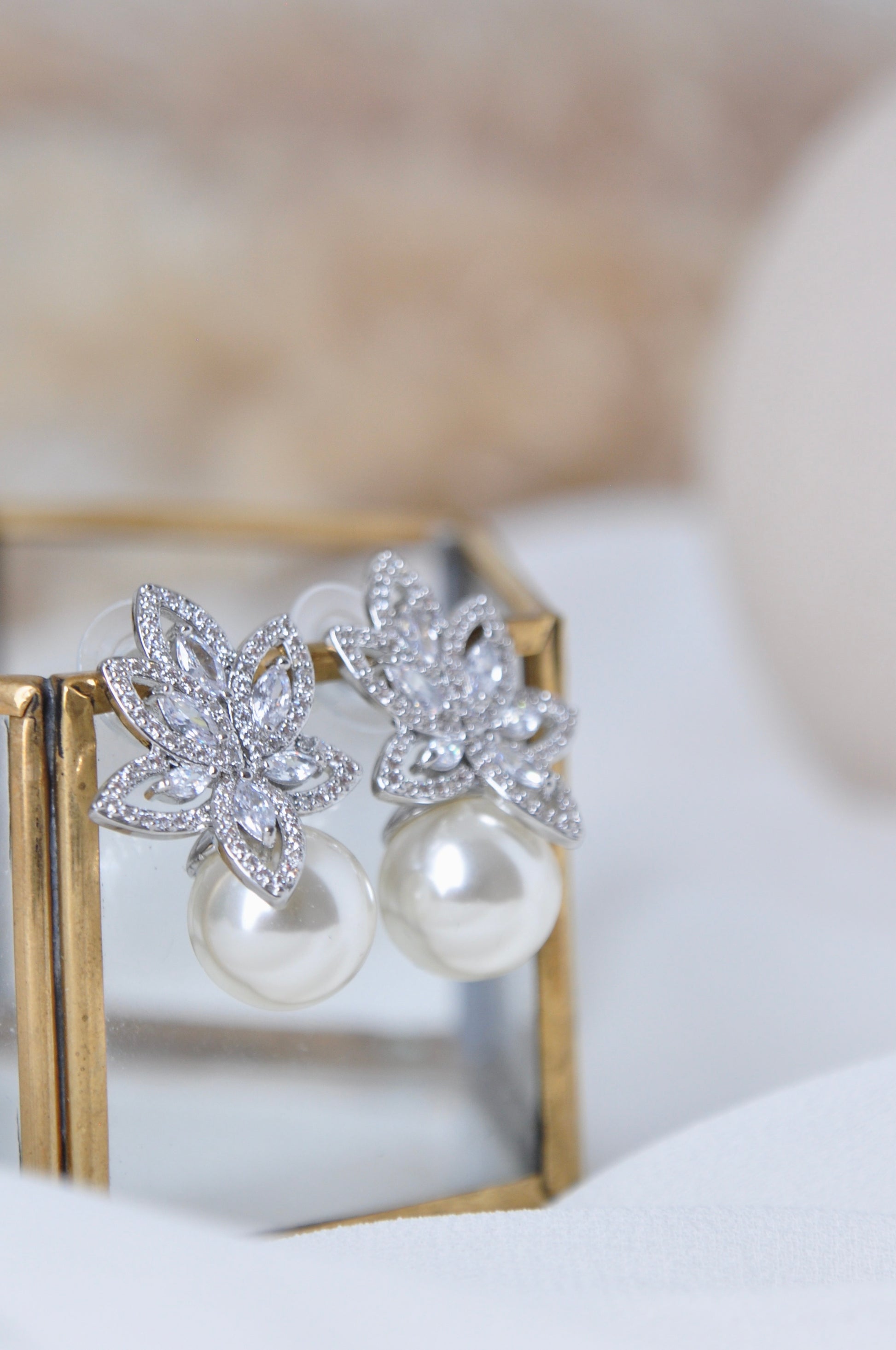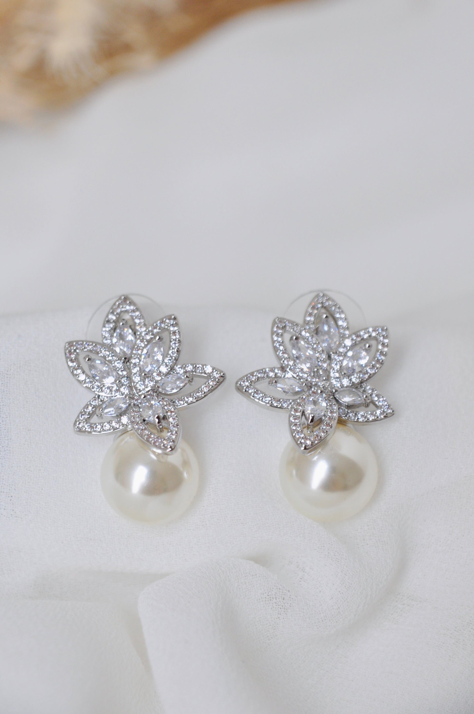 Aretes de aleación de cobre con baño plata, zirconias y perla.