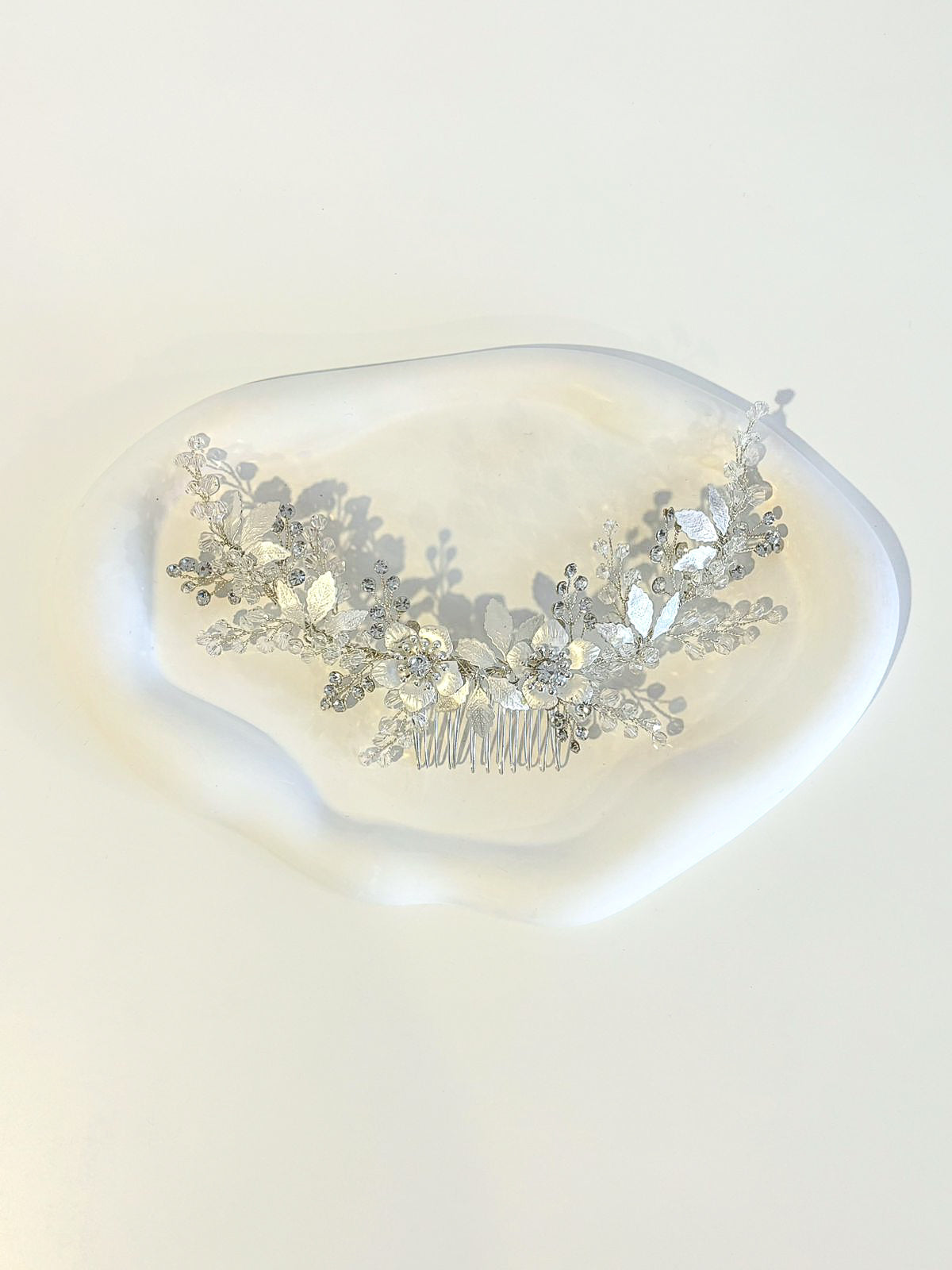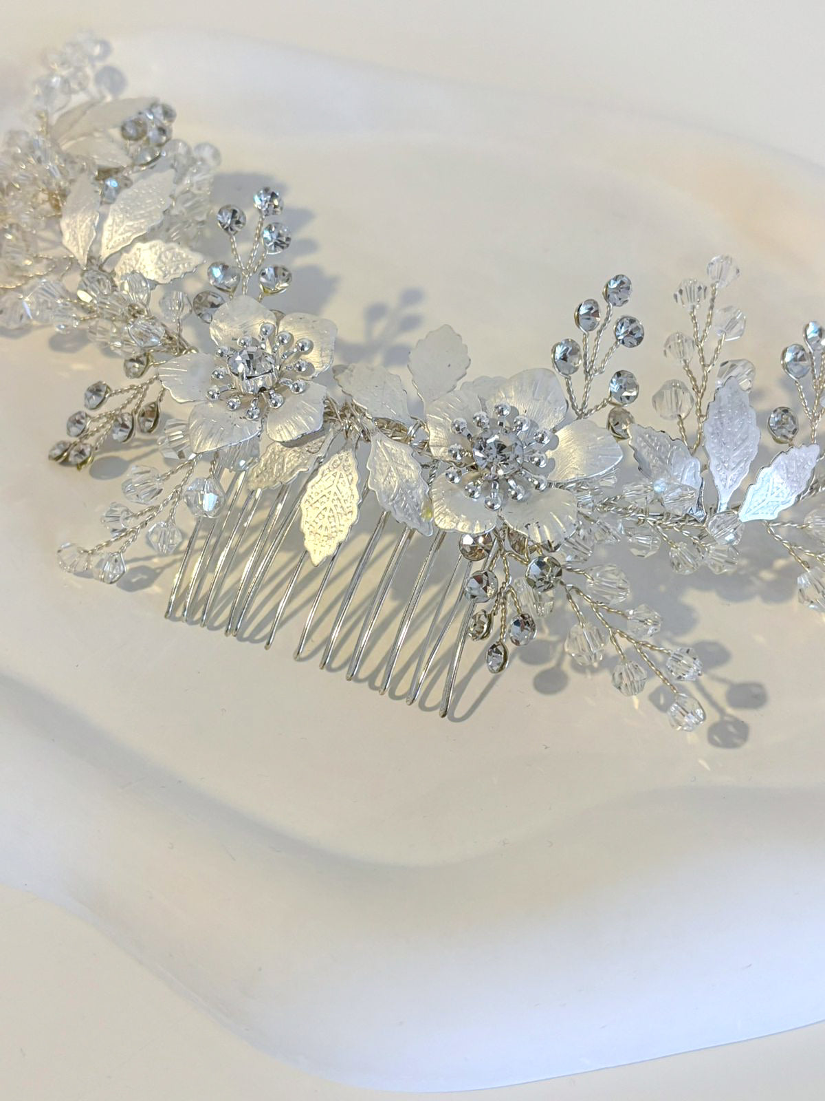 Peineta de flores y hojas metálicas semi mate con combinación de cristales. La pieza ideal si quieres un tocado en tonos plata sin que brille mucho.
