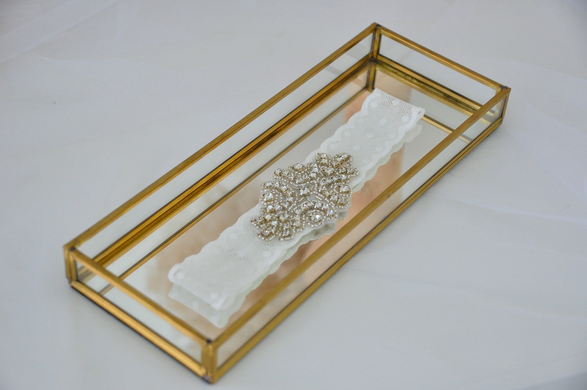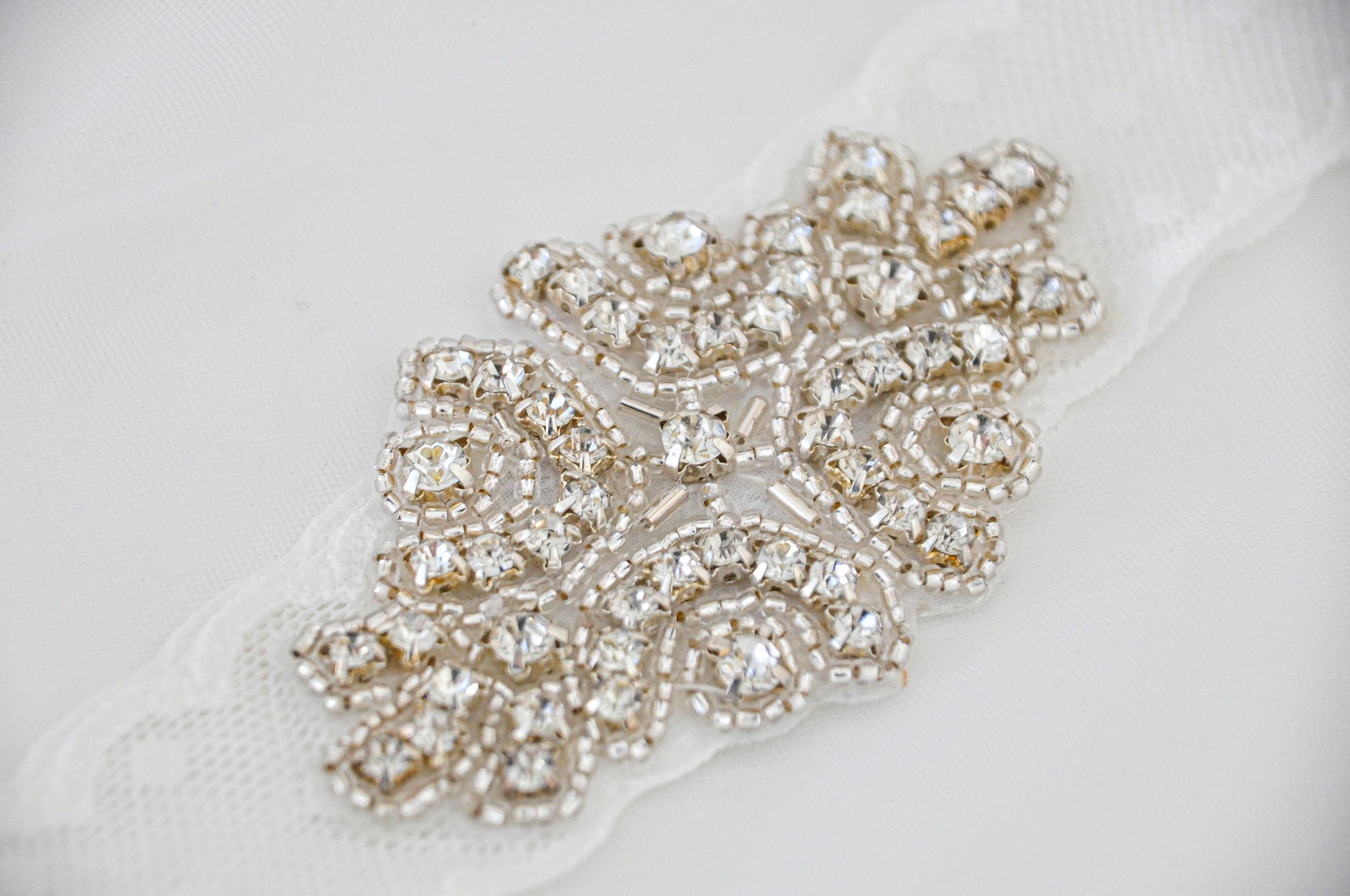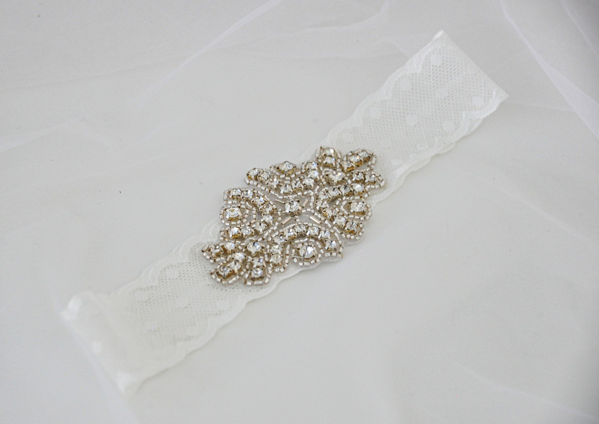 Liga para novia de encaje elástico blanca con aplicación de cristales.