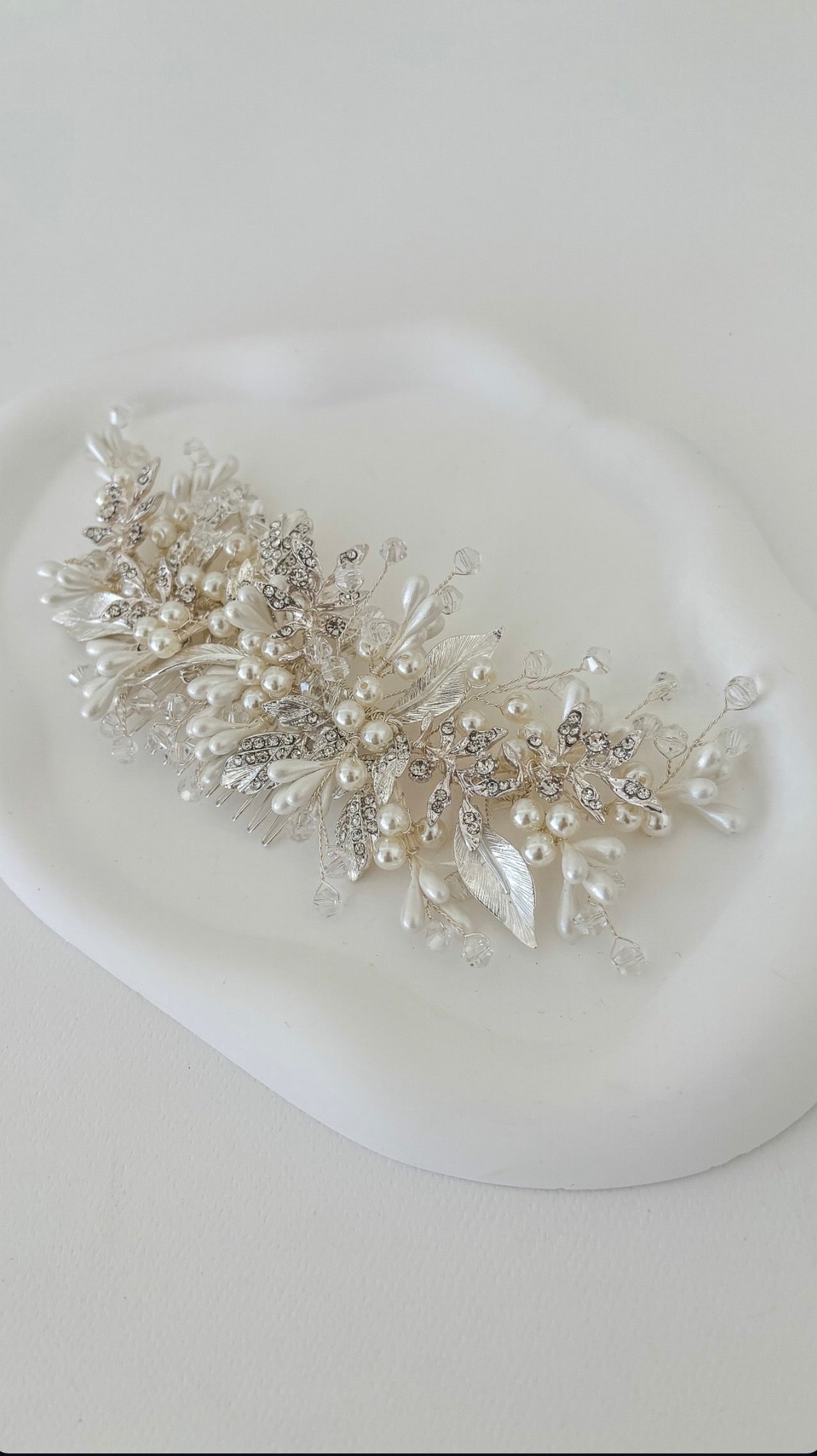 Peineta estilo romántica con hojas semi mate metálicas, azares y cristales.